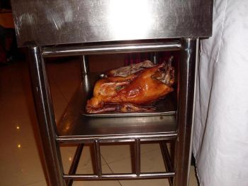 Abends brauchten wir uns auch nicht ums Abendessen zu kümmern - wir fuhren mit knapp 30 Leuten zum Pekingenten-Essen. Die Hinfahrt dauerte aufgrund des Feierabendverkehrs und der Staus über eine Stunde. Das Essen selbst war auch ein nettes Erlebnis. Begonnen wurde mit verschiedenen kalten und warmen Vorspeisen, die mit Stäbchen zu essen waren. Für die nicht ganz so ausdauernden "Langnasen" standen aber auch Gabeln zur Verfügung. Dazu gab es chinesischen Rotwein sowie Jasmintee und ein weiteres Getränk nach Wahl (Bier, Wasser, Cola o. ä.). Die Pekingenten selbst wurden am Tisch zerlegt und serviert.