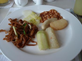 Auf der Fahrt zur Wangfujing Dajie hat sich übrigens der Ausspruch unseres Reiseführers "Verkehrsregeln sind in Beijing nur theoretisch" bewahrheitet. Wir hatten uns vom Hotel ein Taxi bestellen und dem Fahrer unser Ziel erklären lassen. Die Taxifahrt in die Innenstadt war sehr abenteuerlich, wichtigste Ausstattung an allen Fahrzeugen ist hier - neben dem Gaspedal - ganz eindeutig die Hupe! Busse, Autos, Motorroller, Fahrräder - alles fährt hier kreuz und quer, eingezeichnete Fahrspuren braucht man doch nicht wirklich. Fußgänger müssen beim Überqueren der Straßen gewaltig aufpassen, dass sie nicht unter die Räder kommen, denn auch eine grüne Fußgängerampel garantiert noch keinen sicheren Weg. Noch interessanter war es natürlich, aus der Innenstadt zum Hotel zurück zu kommen, wenn man kein Chinesisch spricht und der Taxifahrer kein Englisch versteht. Zwar gibt es hier im Hotel ein Kärtchen, auf dem die Anschrift in chinesischen Schriftzeichen vermerkt ist, aber was hilft das, wenn die Taxifahrer kein Navigationsgerät haben und sich nicht auskennen? Doch mit ein wenig telefonieren hat sich unser Fahrer dann schließlich noch zum Hotel durchgeschlagen ;-) Montag, 17. August 2009: Peking lässt grüßen Heute war es richtig kühl, nur 26 Grad, aber eine tropische Luftfeuchtigkeit, die uns ein ganz klein wenig kleben ließ. Der Tag startete wieder mit einem sehr gesunden Frühstück.