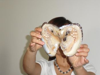 Nachdem wir die 72 ha (= 720 000 qm) Gelände der Verbotenen Stadt durchquert hatten, ging es mit dem Bus weiter zu einer Perlenzucht. Hier wurde uns zunächst mittels eines kurzen Films - in deutscher Sprache! - gezeigt, wie eine Muschel für die Perlenzucht präpariert wird. Die Perlen wachsen bis zu 6 Jahren in der Muschel, erkennen kann man das Alter ähnlich wie bei Bäumen an den Jahresringen der Muschel! Dann wurde eine Muschel aus dem Becken gefischt und geöffnet - es waren 30 Perlen enthalten, jeder von uns durfte eine mitnehmen!